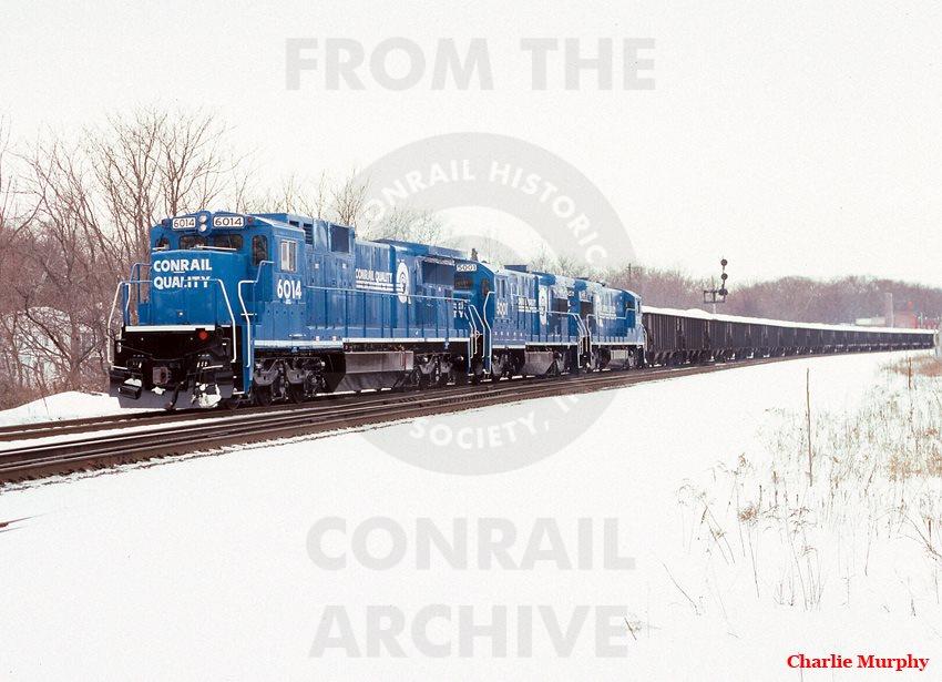 CR 6014, 5001 & 5056 are all freshly painted on the point of a UBB coal train of Cambria & Indiana hoppers during the winter of 1994.