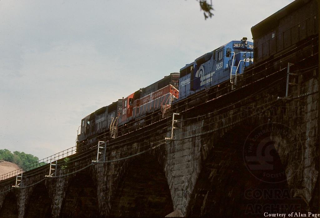 CR SD-35 6016, BAR GP-38 87, GP-35 3633 (ex-RDG), and an SD-45 cross Rockville Bridge with a load of hoppers in May, 1977.