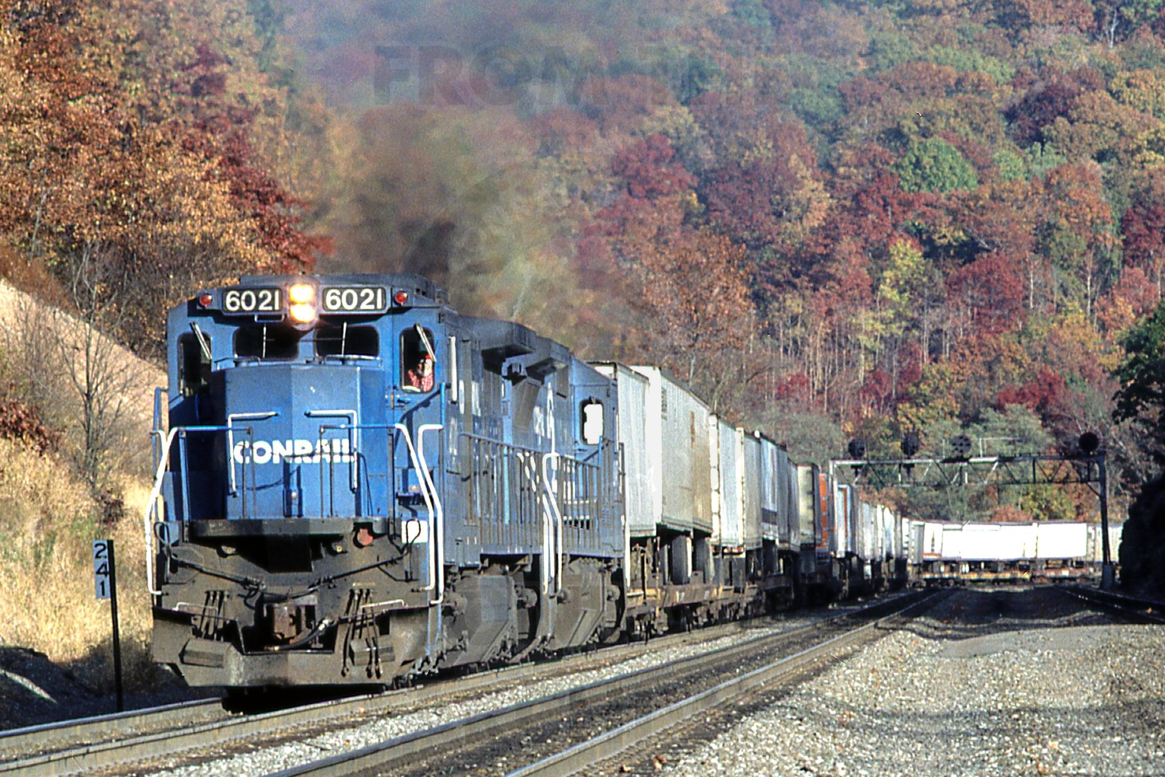 Previous Next Photo By Rich Bowes CR 6021 GE C40-8 PITTSBURGH LINE LOGAN TOWNSHIP PA WITH TRAIN MAIL3 Year 1992 Original Date 10/1/92 Location Logan Twp PA Equipment Type GE C40-8W Conrail Number 6021 Additional Galleries Rich Bowes' Conrail Photographs Line or Locale Conrail's Pittsburgh Line East Slope West Slope and Horseshoe Curve Operations Collection CRHS Conrail Photo Archive Contributions
