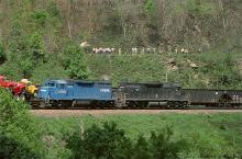 While a train of hoppers is pushed up Horseshoe, CR SD-35's 6030 and 6018 roll mixed freight down the Curve on May 22, 1977.