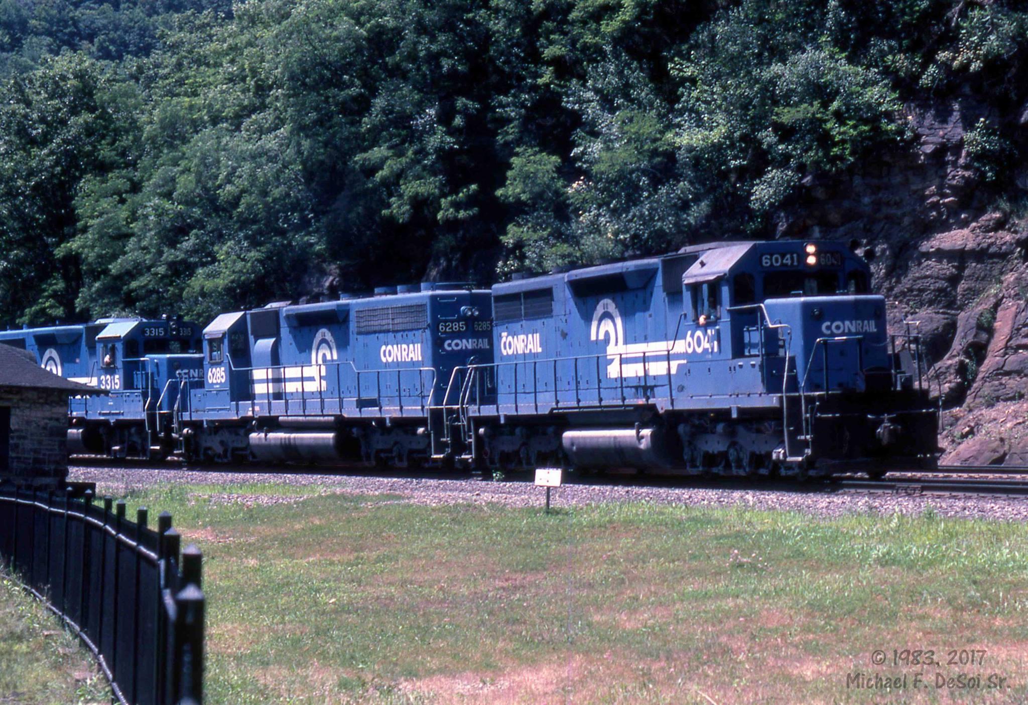 Conrail SD-35 #6041 (ex CNJ) heads east 'round the curve at Horseshoe Curve in Altoona, PA. July 10, 1983.