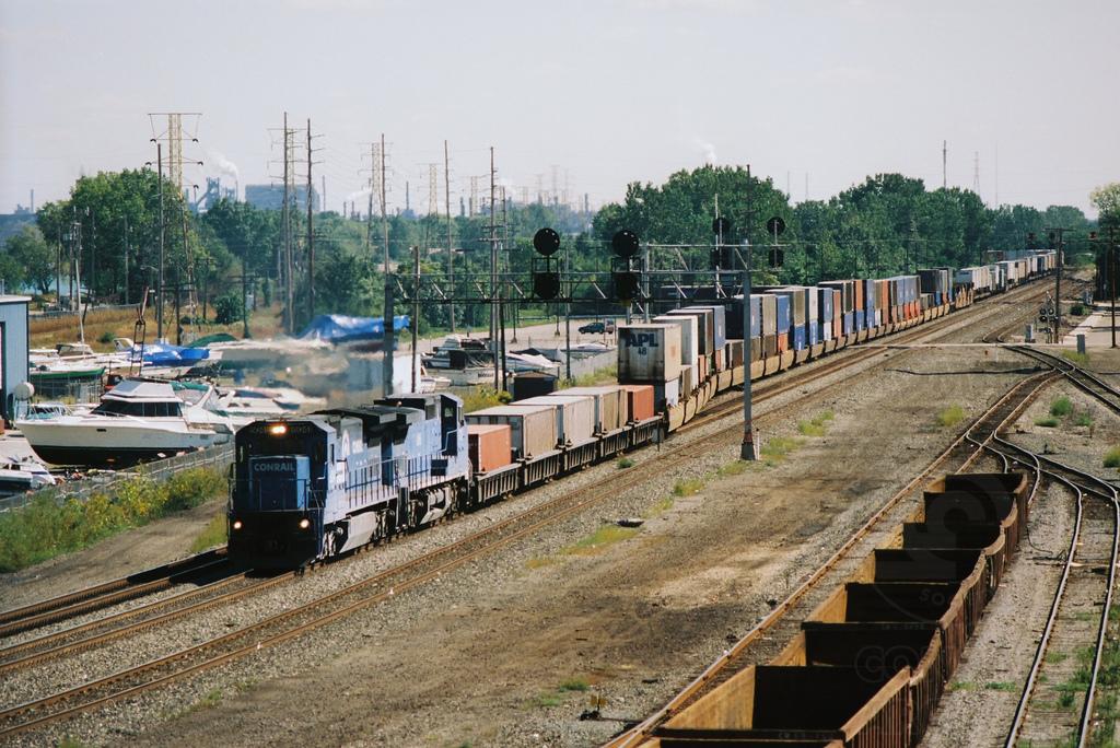 Conrail C40-8 No. 6041 leads a westbound intermodal through the crossover at CP507, in September 1998. Doug Davidson photo with permission