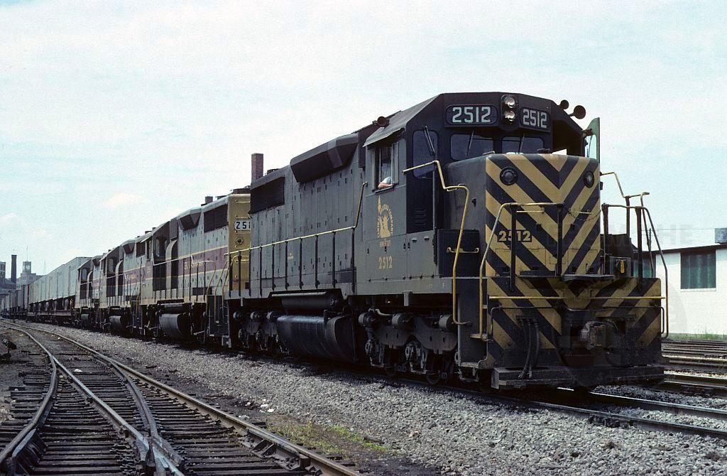 One Central Railroad Company of New Jersey SD35 and three Erie Lackawanna GP35's have train TV-98 in tow at South St TBS in Akron,Ohio in June 1976. This train will cross from the "PC side" to the "EL side" for the remainder of it's trip to Croxton.