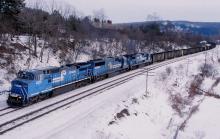 UNL15B, an empty train from NYSEG's plant at Ludlowville, has come off the Ithaca Branch, and is now headed for Gang Mills and a new crew. The train will eventually wind up on the Monongahela to reload. View is from the NY 427 overpass at Chemung.