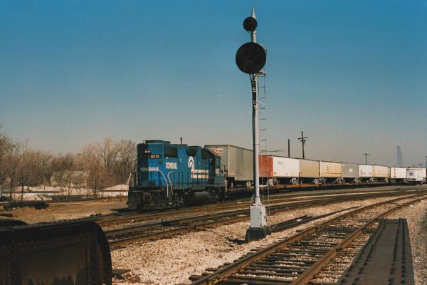 This set of Conrail power, led by the 6068, has dropped its intermodal train at 55th Street Yard and is seen backing by C&WI's 47th Street Tower to reach the engine terminal at 51st Street Yard in February 1996. Doug Davidson photo with permission
