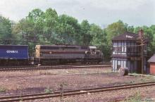 Conrail SD45 6069 (ex-EL 3604) is seen passing MO tower in Cresson in 1982.