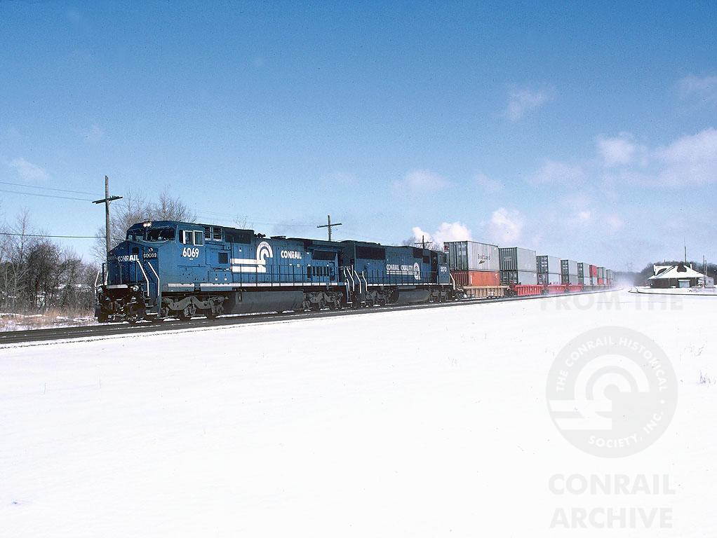 Conrail 6069 leads WestboundTV-555 at MP127.9 on track number one.