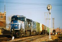A Conrail freight led by C40-8W 6069 waits for a BNSF crew to forward it west at the Western Avenue Interlocking Chicago, IL in November 1998. Train is most likely ELBN. Doug Davidson photo with permission