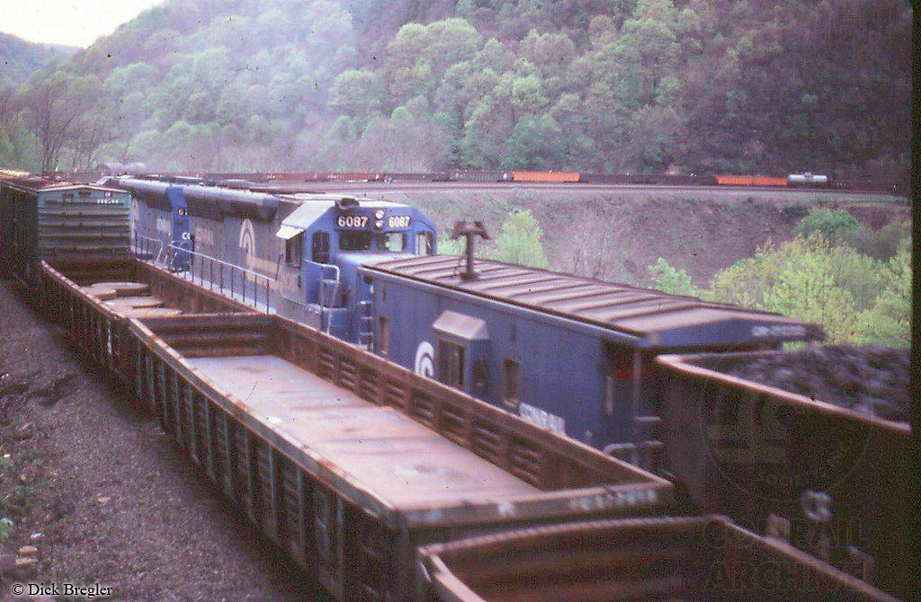 A 1981 shot shows Conrail 6087 (ex-EL 3622) shoving a westbound train around track 2 of Horseshoe Curve while another train ascends the grade on track 2.