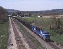 C40-8W 6090 and mate have coal train UNC210 rolling along at Arkport-Canaseraga Rd. outside of Canaseraga, NY. on May 7, 1993. Note the grade separation and "de-railed" former eastward main at left.