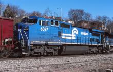 Previous Next CR 6097 eastbound at Rochester, PA on 2/7/1998. Photo By Jeff Weaver Year 1998 Original Date 2/7/98 Equipment Type GE C40-8W Conrail Number 6097 Collection CRHS Conrail Photo Archive Contributions