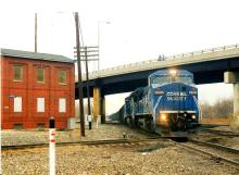 Conrail C40-8W 6109 leads a northbound (eastbound time table direction) loaded coal train through Crestline, OH sometime between Nov and Dec in 1996. This train is moving on Conrail's Indianapolis Line (ex-NYC mainline) after having just come through Galion, OH. It is crossing over the diamond which is Conrail's Fort Wayne Line (ex-PRR Phila-Chicago mainline). In the background is Crestline tower and behind it the connecting track between the 2 mainlines. At this time, the ex-PRR shops at Crestline were still standing, but were pretty much abandoned. The Indy Line is now CSX; the Fort Wayne line is now NS from Pittsburgh to the Crestline diamond. West of the diamond, the FW Line is now the Chicago Fort Wayne & Eastern (a regional railroad).