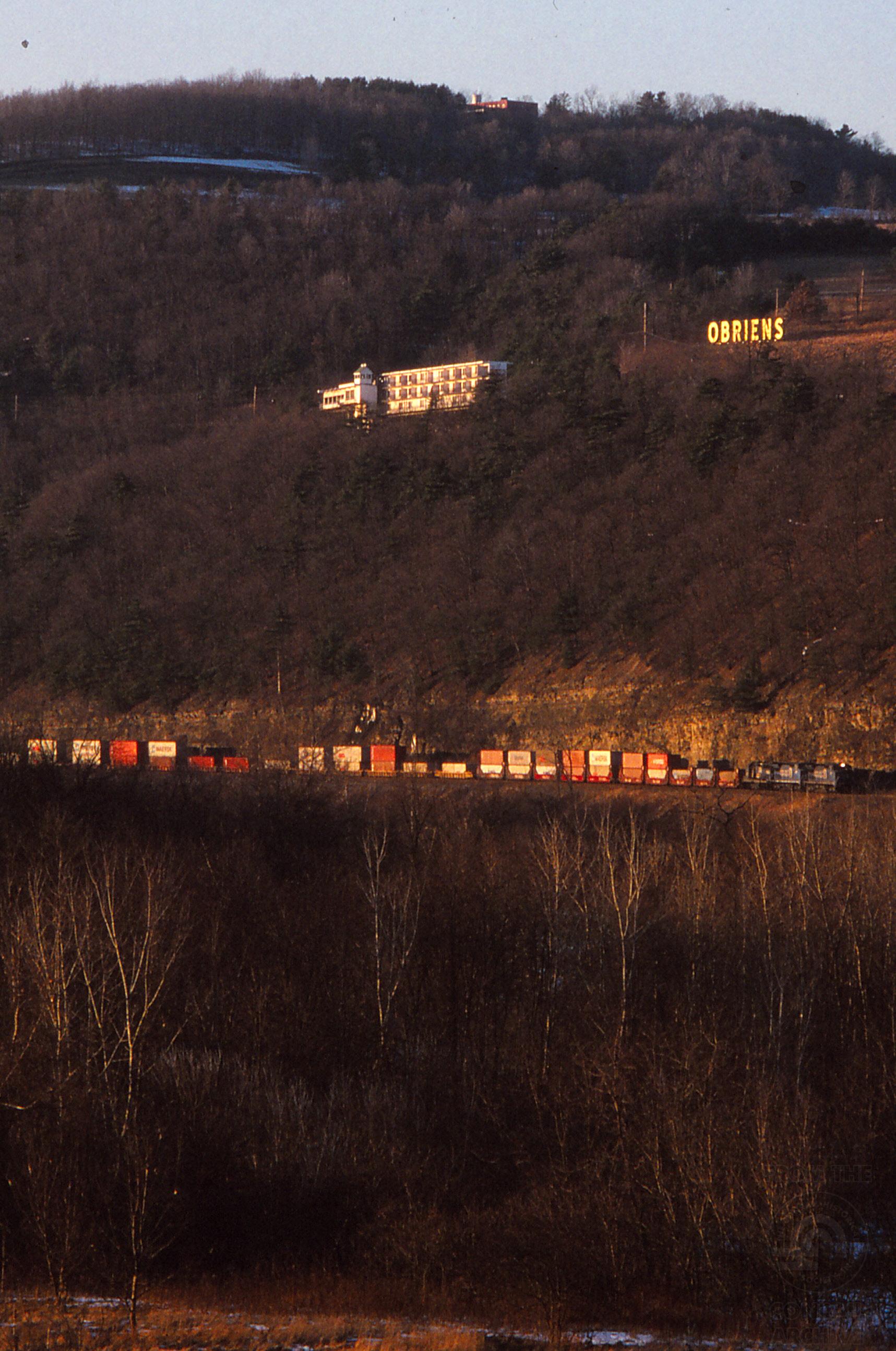 TV 202 rolls east along the cliff just west of Waverly, under the familiar sign on top of the hill for O'Brien's Inn, a longstanding familiar sight for travelers heading east on NY 17. The photo is taken from a hillside adjacent to the Exit 60 off ramp.