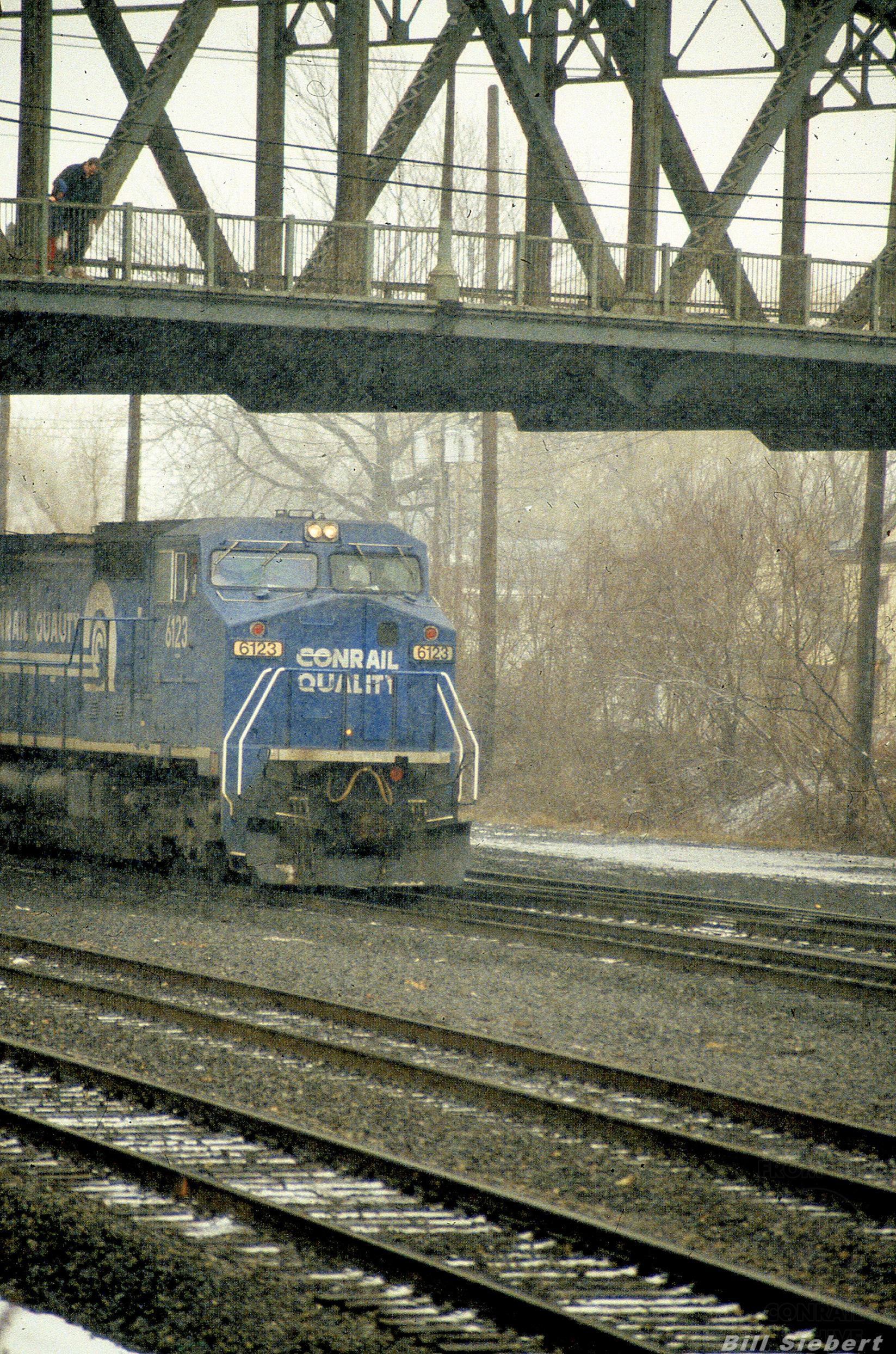 SD45 6123 heads a westbound under the old Bridge in East Syracuse during a snow squall in 1992