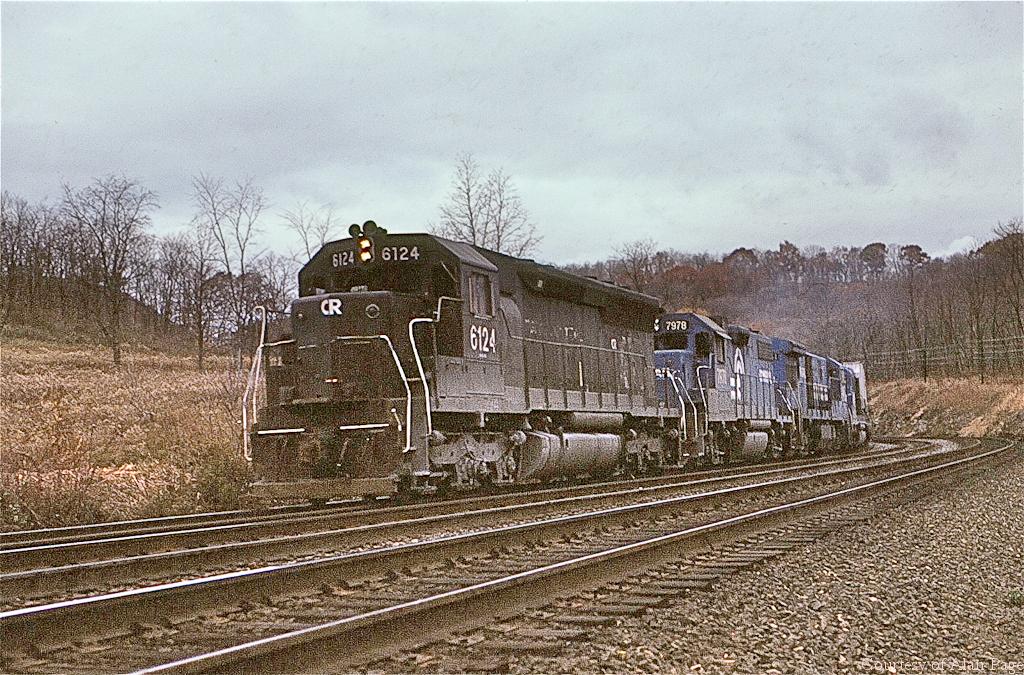 Former PC SD-45 6124 leads CR blue GP38-2 7978, U33C 6861(ex-PC 6556), and GP-40 3138 with a string of piggybacks through Spruce Creek in November, 1980.
