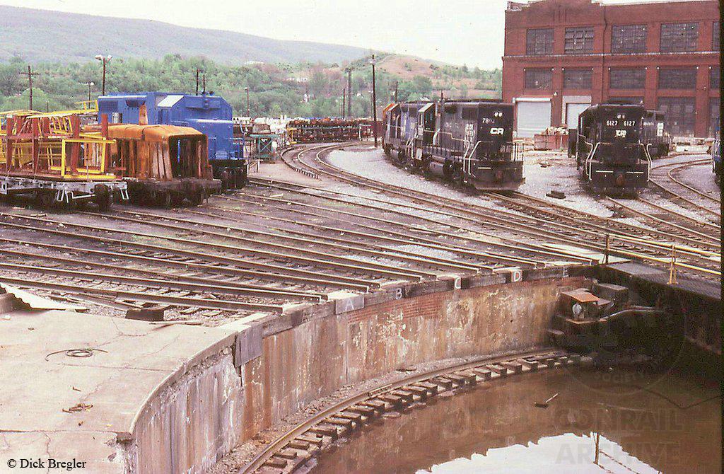 Conrail SD45 6127 (ex-PC 6127, nee-PRR 6127) is sitting behind the Juniata E&M Shop along with GP38 7802 (ex-PC 7802) in 1981. The unit in fresh blue paint appears to be another GP38, looking like a modeler's unfinished project with the masking tape still applied to its windows.