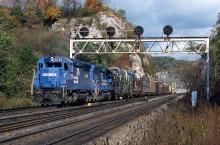 CR 6135 charges east through Union Furnace PA on the Pittsburgh Line, 10/78