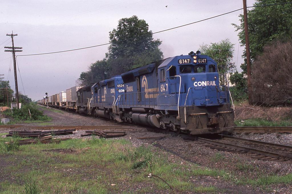 CR 6147, 6524 & another SD45 lead TV-4 east over the diamond with the Reading at Boundbrook NJ in July of 1982.