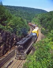 SD45 6153 shoves RISE through the Middlefield Twin Ledges on July 18, 1981. The ledges are about 3/4 mile west of Bancroft.