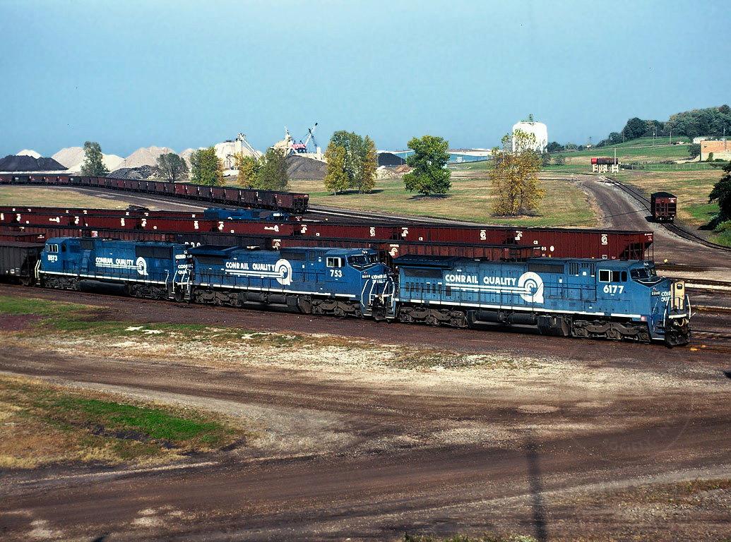 Conrail C40-8W 6177, C40-8W 753, and SD60M 5573 wait to pull their empty train South at Conrail's Ashtabula Harbor Ohio Yard.