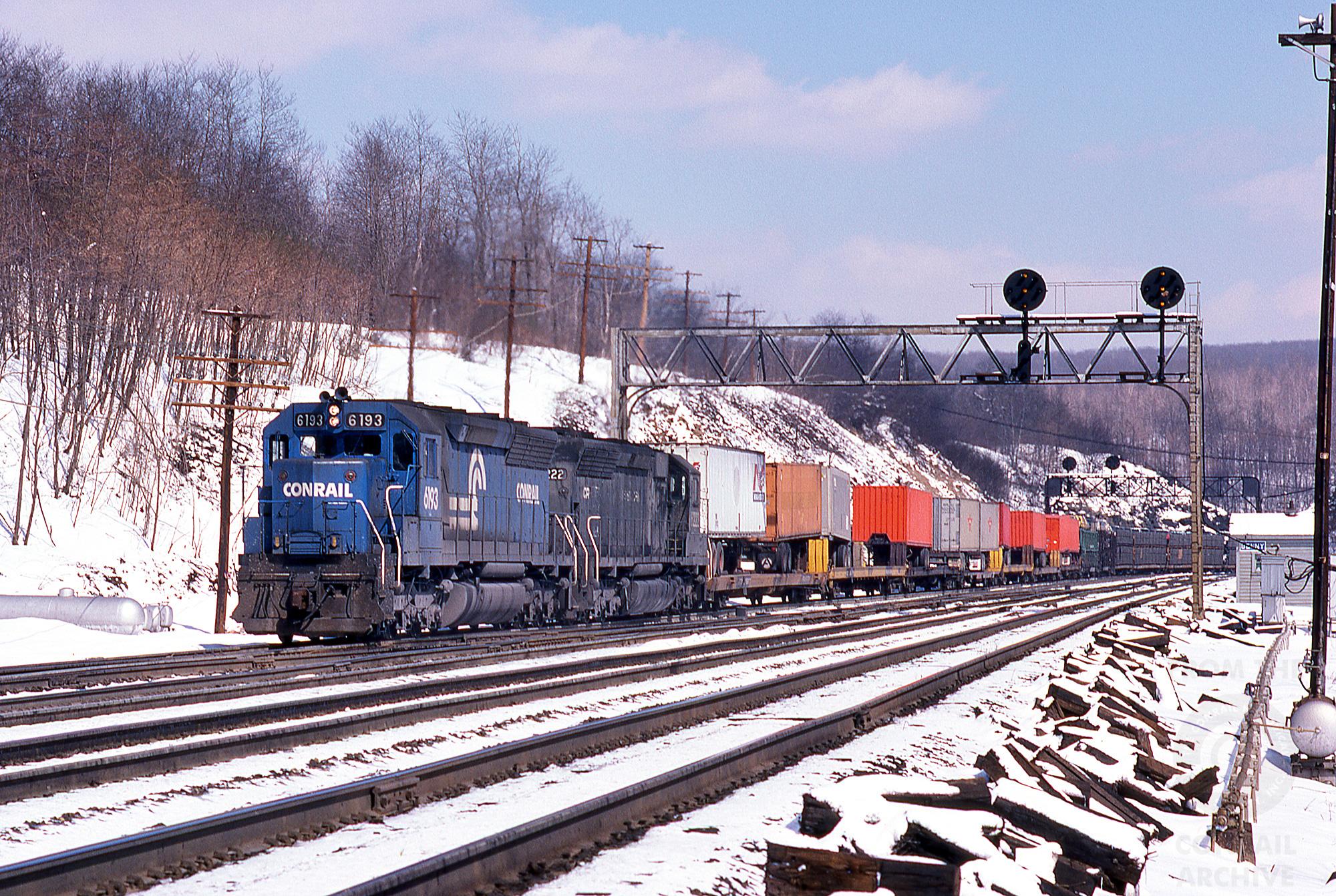 Conrail painted power is starting to show up on a somewhat regular basis at this point. SD45 No. No. 6193 leads a WB TV Train upgrade at Benny Interlocking in Bennington, PA on 3/18/78.