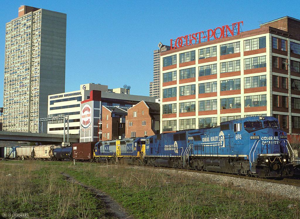 Conrail C40-8W 6196 is seen leading ALCS on the CSX Philly Sub in downtown Philadelphia, PA on 4/14/1996
