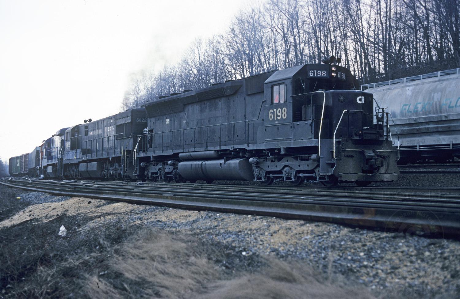 ENCO-3 is seen departing Enola for Columbus, OH behing a mixed bag lash-up that includes BAR GP38 #86