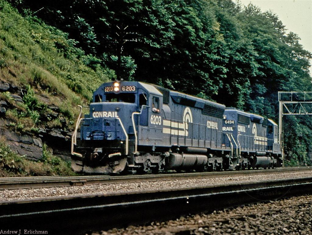 Helper duo CR SD-45 6203 (ex-PC) and 1979-built SD-40-2 6494 head down the Curve to assist another train up the hill in August, 1981.