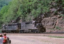 CR pushers SD45 6204, and SD40 6318 run light down Horseshoe Curve on May 22, 1977.