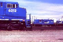 The nose of C40-8w 6212 sits by the road while in the background can be seen hump power GP10 7593 and a slub.