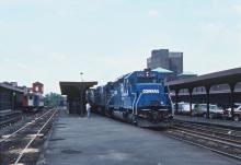 The "class unit" SD40 heads up an eastbound through the station in Springfield, MA. on June 4, 1980.