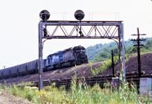 Conrail. SD40-2 #6245 & 6303 helping coal train downgrade at Bennington interlocking. This is part of the Bennington Interlocking plant before the Gallitzin tunnels. August 23, 1977