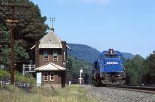 A westbound Conrail manifest climbs upgrade at MG Tower, PA on Sept. 8, 1984, led by SD40-2 No. 6397.