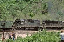 CR SD45 6120 and SD40 6252 push hard on ex-PC N10 class cabin 24041 at Horseshoe Curve on May 22, 1977.
