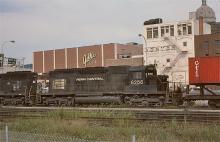Former PC SD-40 6256 at the tail end of a quartet of CR units rushing piggybacks through Altoona in August, 1977.