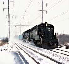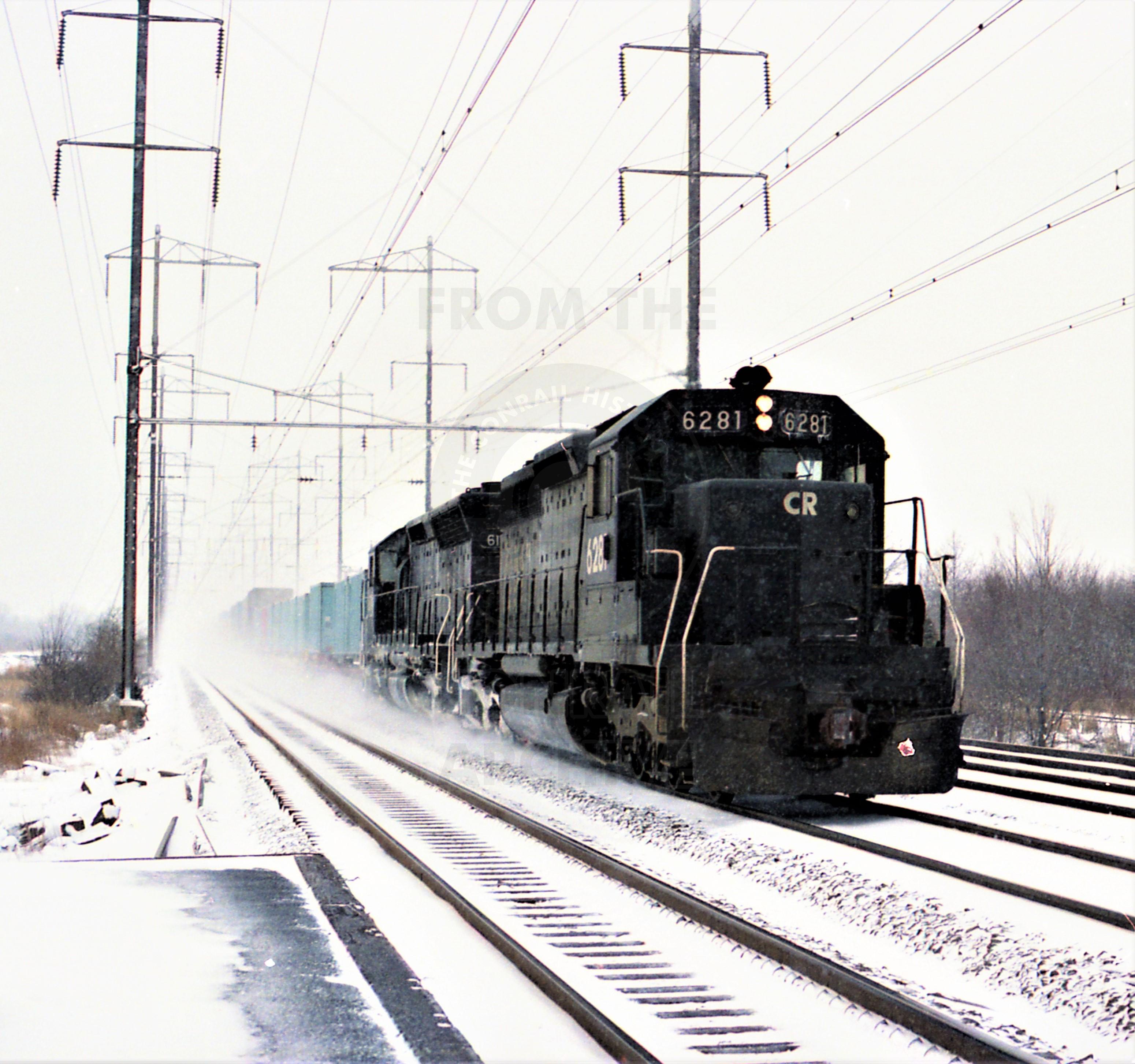 Conrail SD-40 #6281 & SD-45 eastbound trailer train in the snow on the Amtrak NE Corridor. A snowy January 26, 1980. The NE Corridor offered an assortment of trains back then. You could see passenger trains with GG-1's, freight trains with E-33's; E-44's and GG-1's. This is at Adams Station, North Brunswick, NJ. During that time, I lived 1/4 mile from Adams Station and visited the location a few times a week. Scanner radio would pick up conversations from Midway Tower at Monmouth Junction, NJ; County Tower in New Brunswick, NJ & Lincoln Tower in Metuchen, NJ. Even made friends with the Amtrak cops in the area.