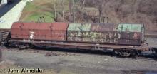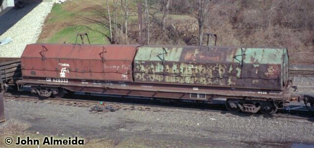 Conrail coil car Class G52B CR 628333 April 1996 ORER description: Gondola, steel, cushion underframe, trough type floor, load with first coil in each trough at outboard ends with progressive loading toward center of car and odd coils loaded near center partition when necessary to prevent overloading of trucks, 30" to 84" diameter coil steel, axle spacing 5' 10", truck centers 44' 8", AAR car type code E641, mechanical designation GBSR.