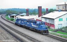 CR helper set 6285 & 6300 drift down the east slope past the brickyard into Altoona for the next assignment of assisting a westbound freight up the mountain. CR 6285 SD40 was ex-B&O 7482/CNJ 3061, and after Conrail, EMDX 6425. Then SD40-2 re-build FURX 3039/NREX 3039. CR 6300 SD40 was PRR 6047/PC 6047. Then CR 6982 after re-build to SD40-2R, & NS 3437 SD40-2.