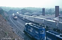 Busy at the brickyard in a light rain. CR 6295 was rear helper on a westbound freight. An eastbound trailer-van train descends the grade. The westbound Amtrak Pennsylvanian climbs upgrade.