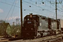 A pair of SD-40s roar through Morrisville with piggybacks on the Northeast corridor in April, 1977