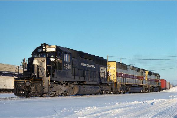 CR 6327, 3285, and 6569 lead a westbound TV train past the Indianapolis division post marker at Crestline, OH on August 15, 1992. Photographer unknown, Chris Howe collection