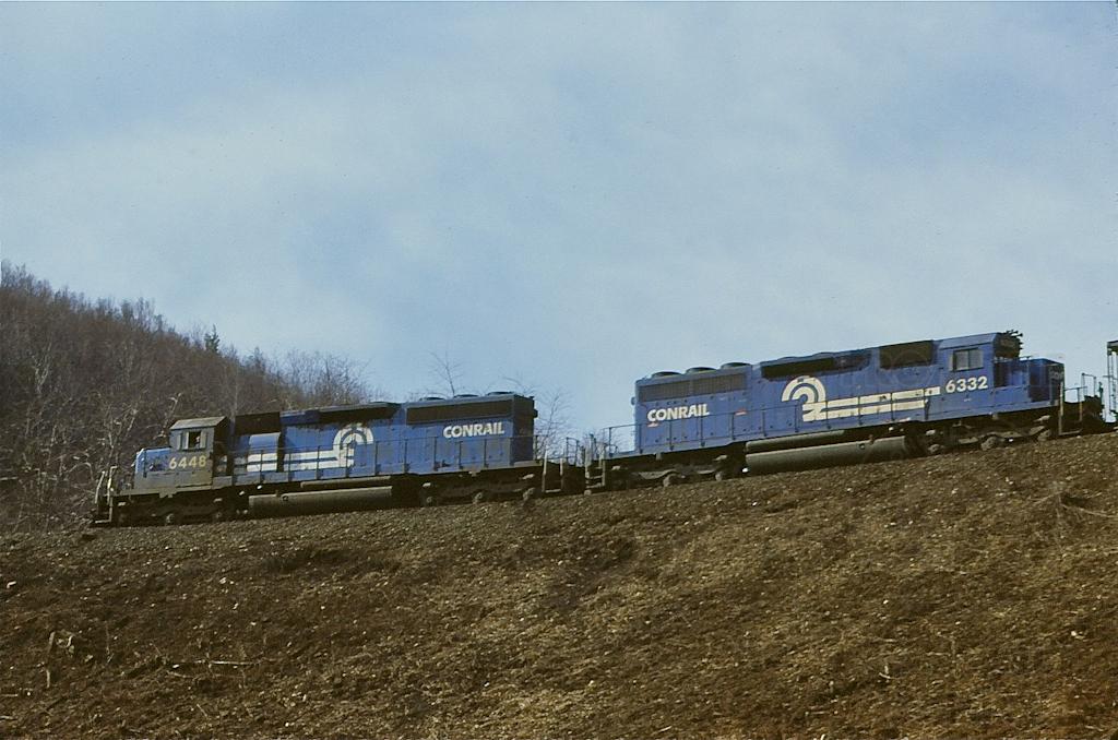 Running light down the hill at Horseshoe are CR SD-40-2 6448 and SD-40 6332 in March, 1981.