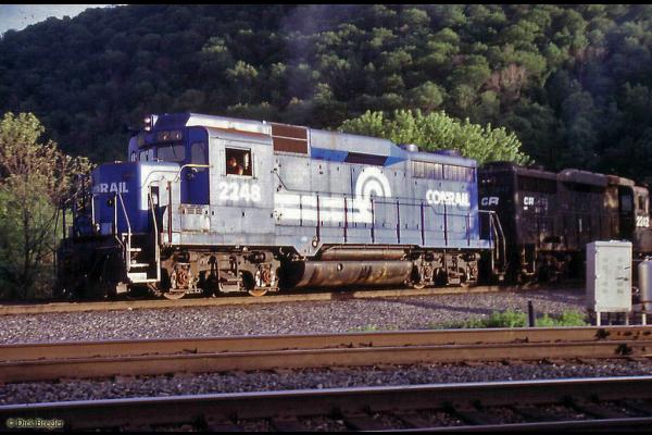 Conrail SD40 6332 is seen sitting outside the diesel shop at Enola Yard in 1986. SW9 8959 is sitting in a line of switchers with their stacks capped.