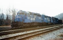 Rolling toward the steam-era coaling tower at the Bethlehem engine terminal, CR SD-40 6334 (ex-PC 6081) leads sister-unit 6303 (ex-PC 6050) through Allentown yard in December, 1988.