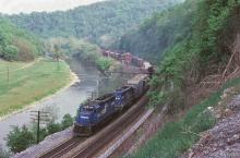 Conrail SD40 6334 (ex-PC 6081) is seen leading a westbound mixed freight past SPRUCE tower in Spruce Creek, PA in 1982.