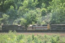 CR SD45 6155 leads SD40 6335, ex-EL GP35 2556 (CR 3662), U25B 2620, and GP38 7661 (ex-PRSL 2001) as they pull hard up Horseshoe Curve on May 22, 1977.