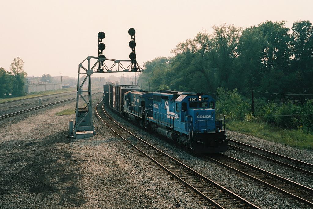 In a view from the tower, an eastbound manifest led by SD40 6341 and B23-7 1950 on the Chicago Line rolls under the classic NYC signal bridge through Berea, OH on Aug. 25, 1991. Little did anyone know back then that the CRHS would save and preserve some of these signals 18 years later in 2009. Doug Davidson photo with permission