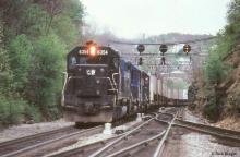 Conrail SD40 6354 (ex-PC 6101, nee-PRR 6101) is seen at CP-UN at Gallitzin, PA with a westbound TV train in 1981.
