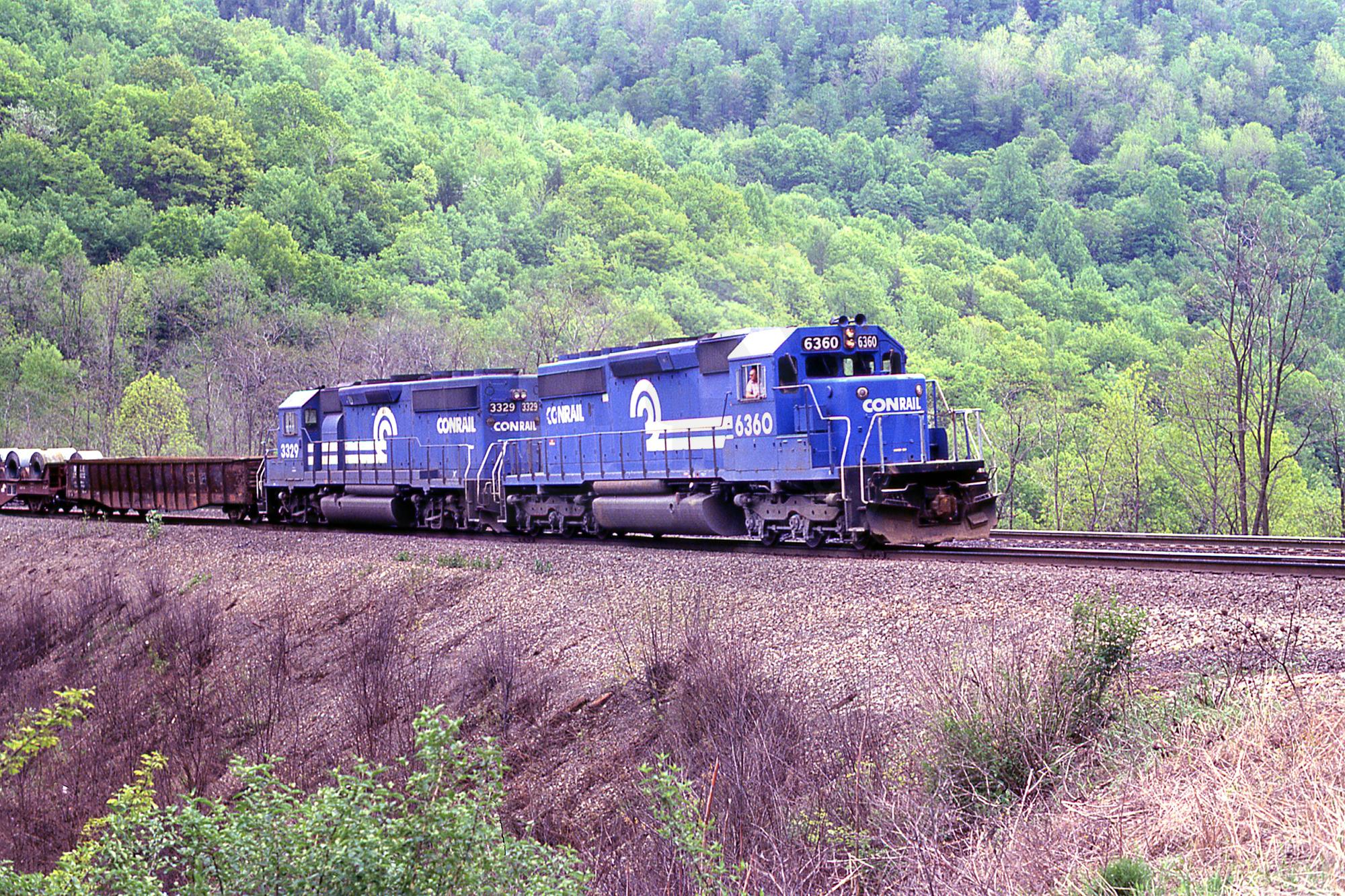 Previous Next Photo By Rich Bowes CR 6360 EMD SD40-2 Pittsburgh Line Logan Twp PA Horseshoe Curve with unknown train Year 1983 Original Date 5/1/83 Location Logan Twp PA Conrail Number 6360 Additional Galleries Rich Bowes' Conrail Photographs Collection CRHS Conrail Photo Archive Contributions