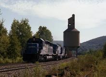 An Eastbound passes under the old coaling tower at the site of the old Erie yard in Susquehanna.